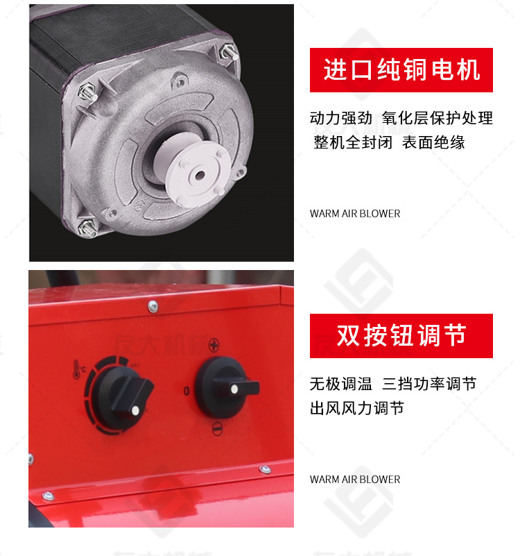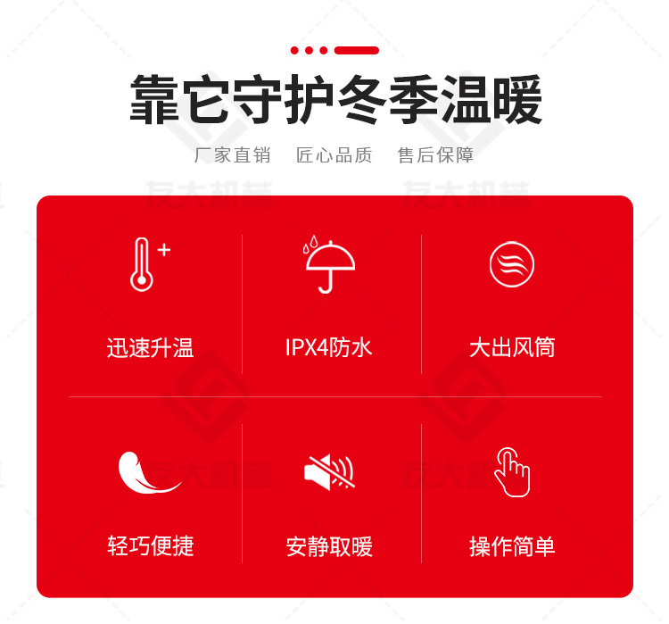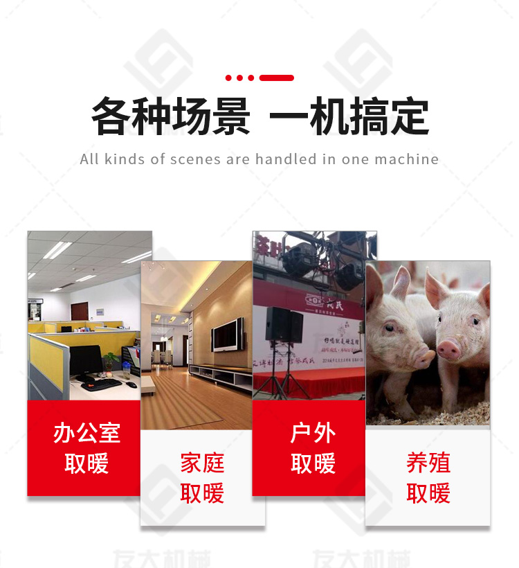 適用范圍:☆養(yǎng)殖、廠房、車間、建筑工地、辦公室、宿舍等局部取暖設(shè)施。 ☆對禽畜取暖,育雛取暖,花卉養(yǎng)殖,大棚蔬菜瓜 果,車間,展會人為取暖等進(jìn)行使用 ☆任何需要加溫的場所。