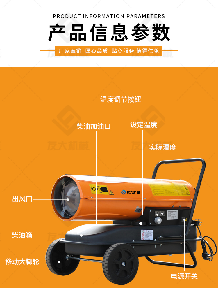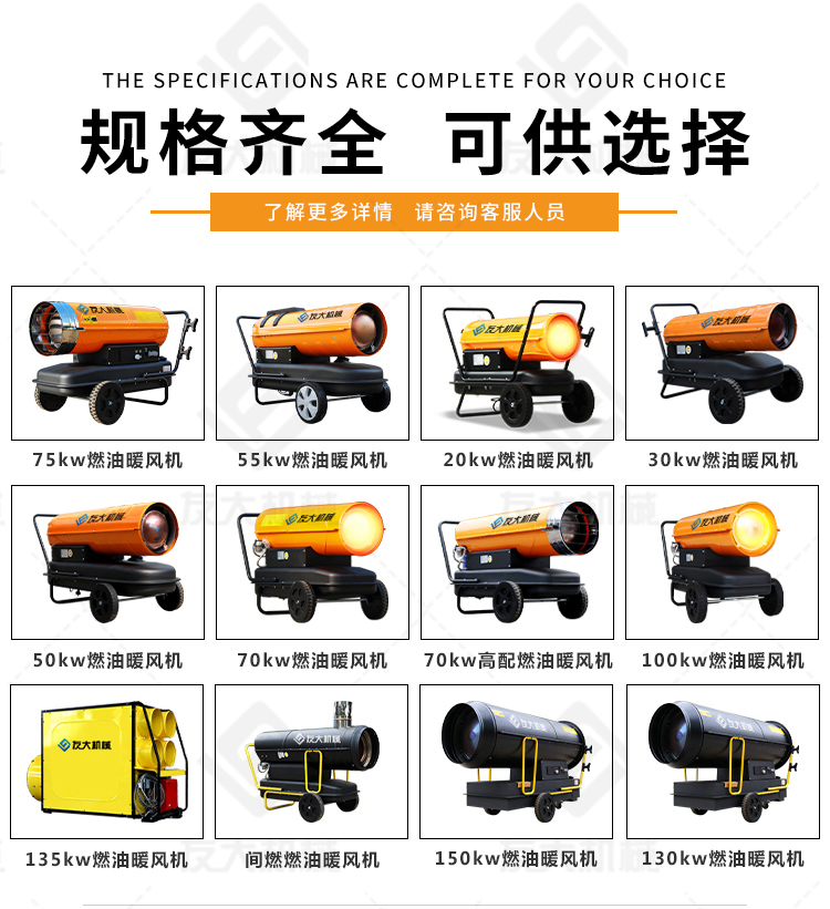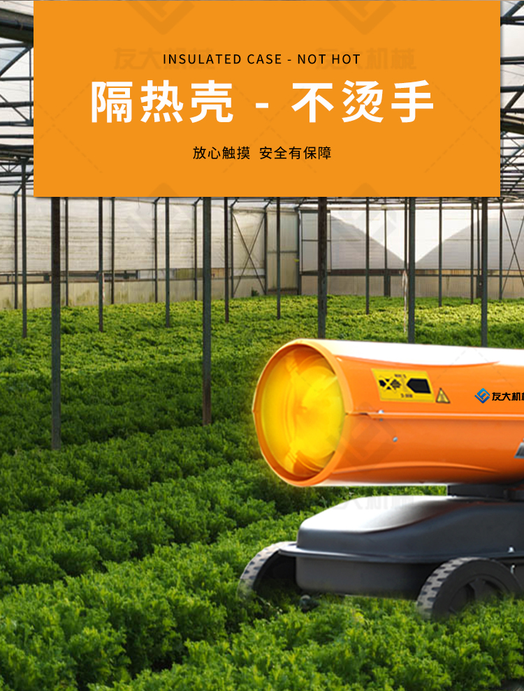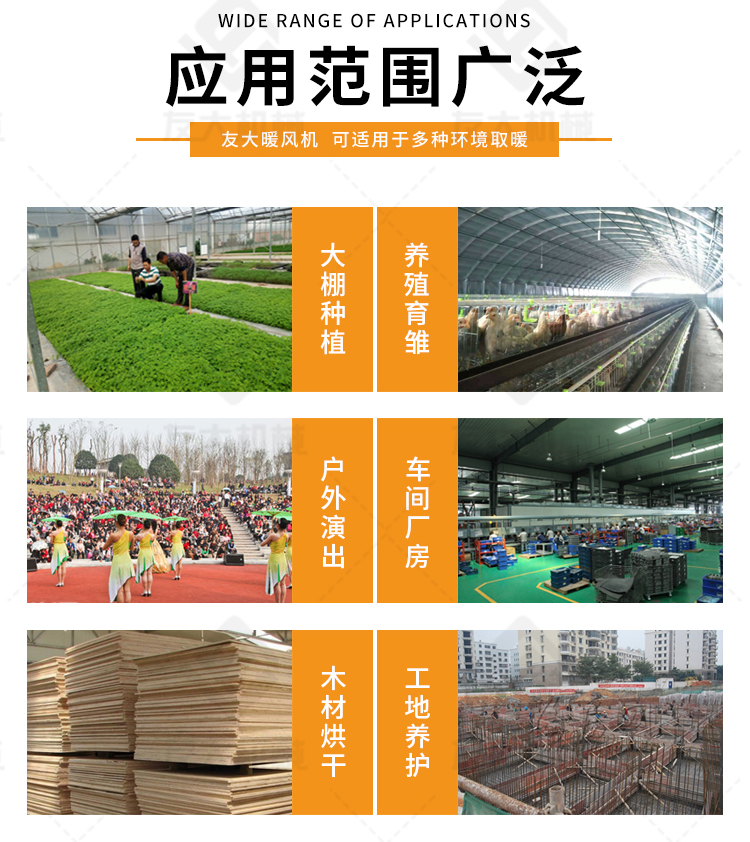 適用范圍:☆對(duì)禽畜取暖,育雛取暖,花卉養(yǎng)殖,大棚蔬菜瓜 果,商場(chǎng),車(chē)間,展會(huì)人為取暖等進(jìn)行使用 ☆任何需要加溫的場(chǎng)所。