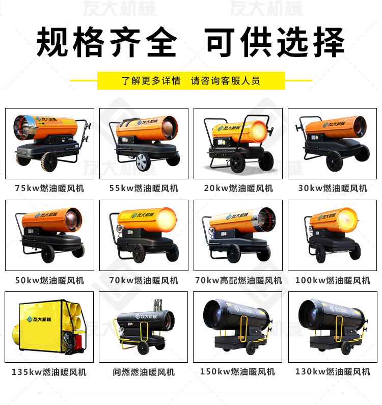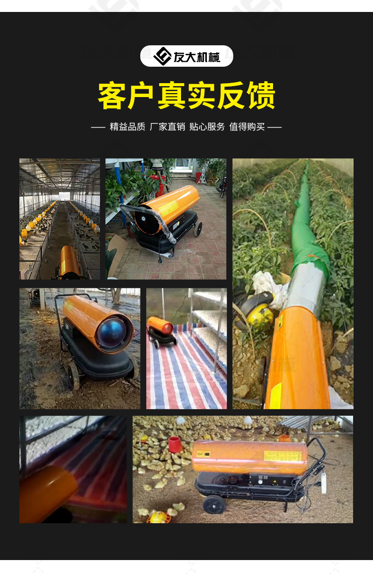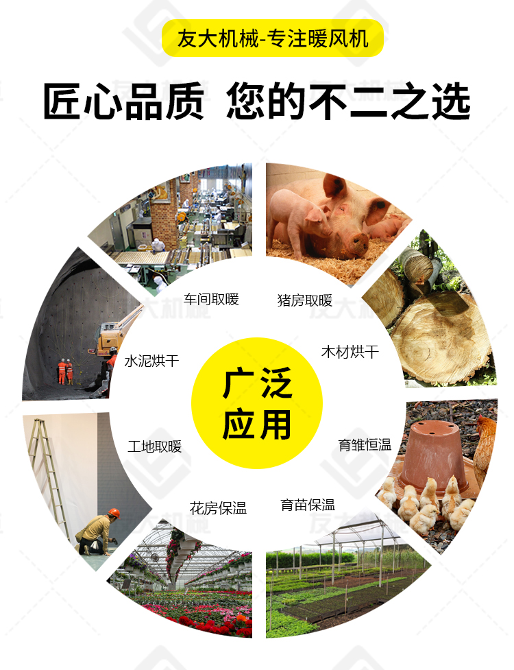 適用范圍:☆養(yǎng)殖、廠房、車間、建筑工地、辦公室、宿舍等局部取暖設(shè)施。 ☆對禽畜取暖,育雛取暖,花卉養(yǎng)殖,大棚蔬菜瓜 果,商場,車間,展會人為取暖等進行使用 ☆任何需要加溫的場所。
