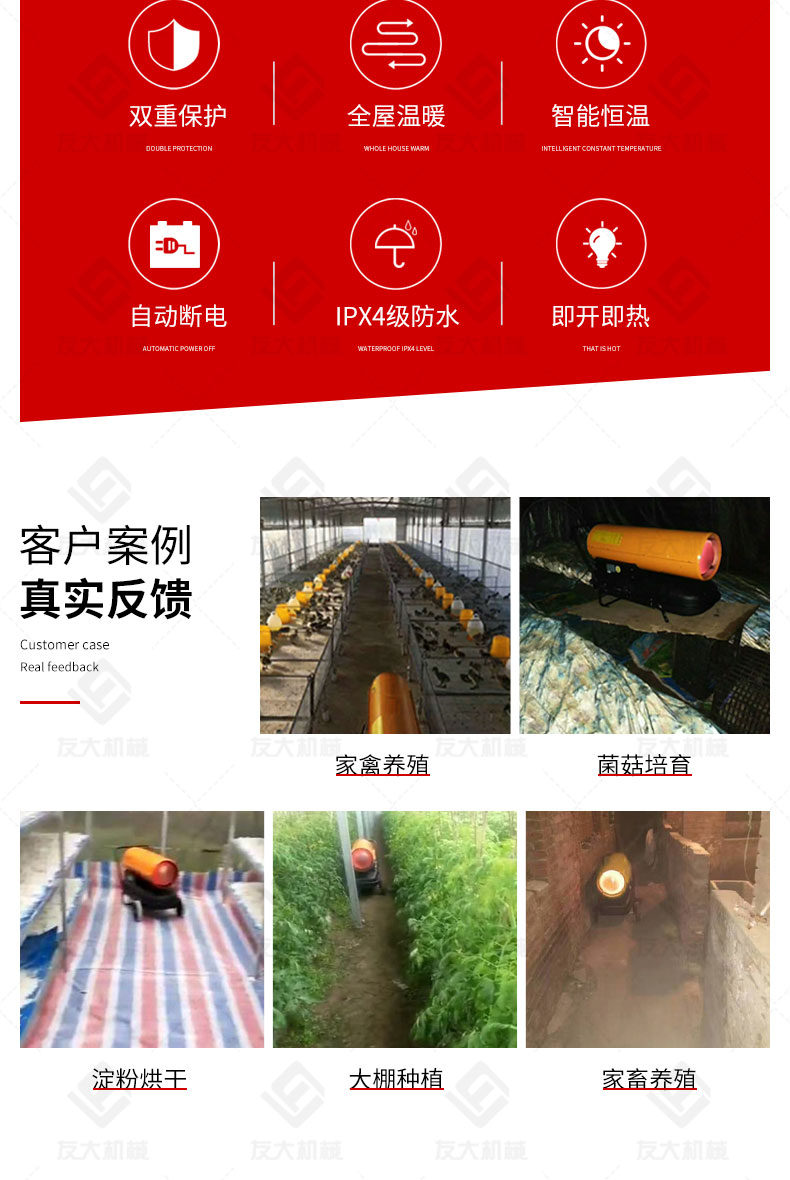 適用范圍:☆養(yǎng)殖、廠房、車間、建筑工地、辦公室、宿舍等局部取暖設(shè)施。 ☆任何需要加溫的場所。